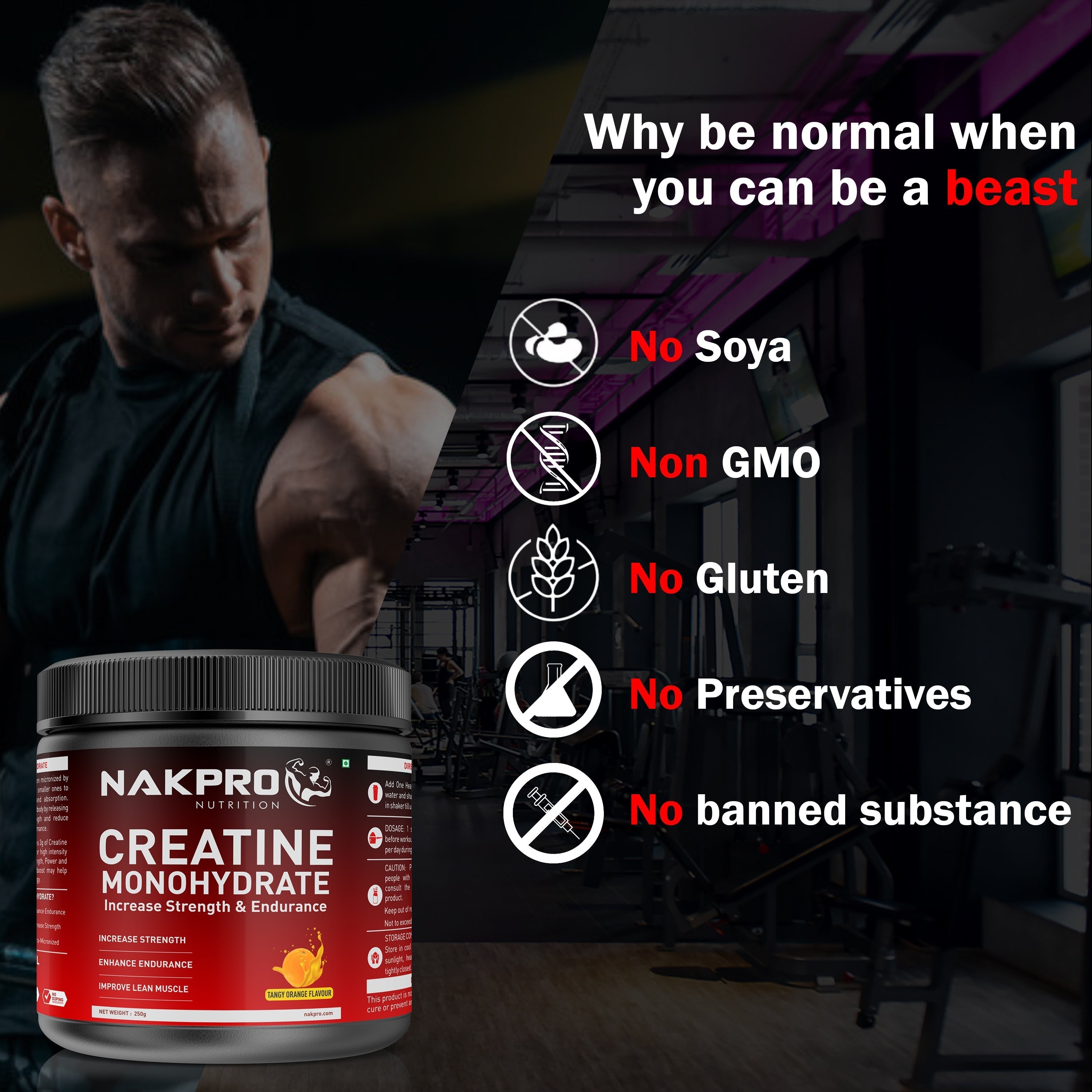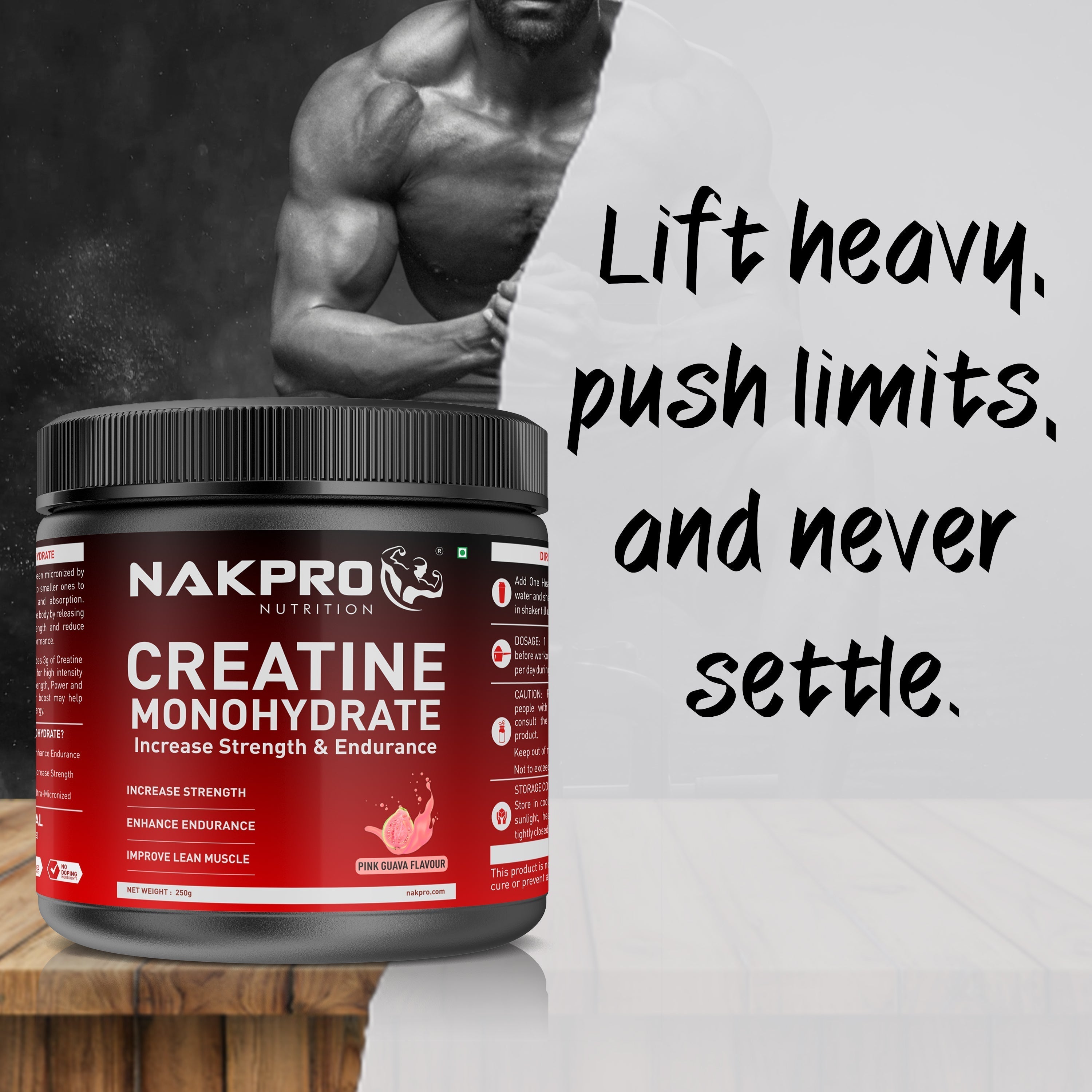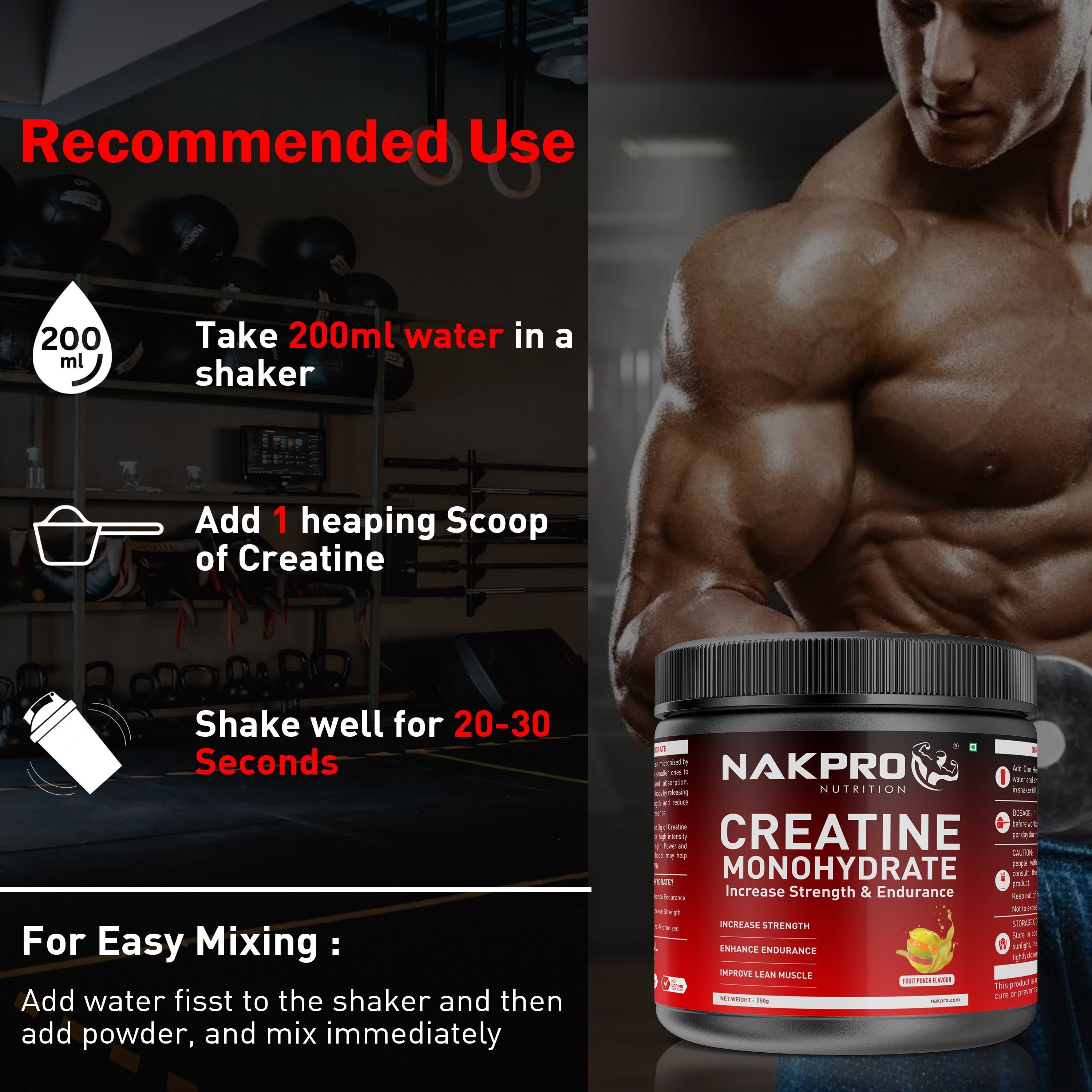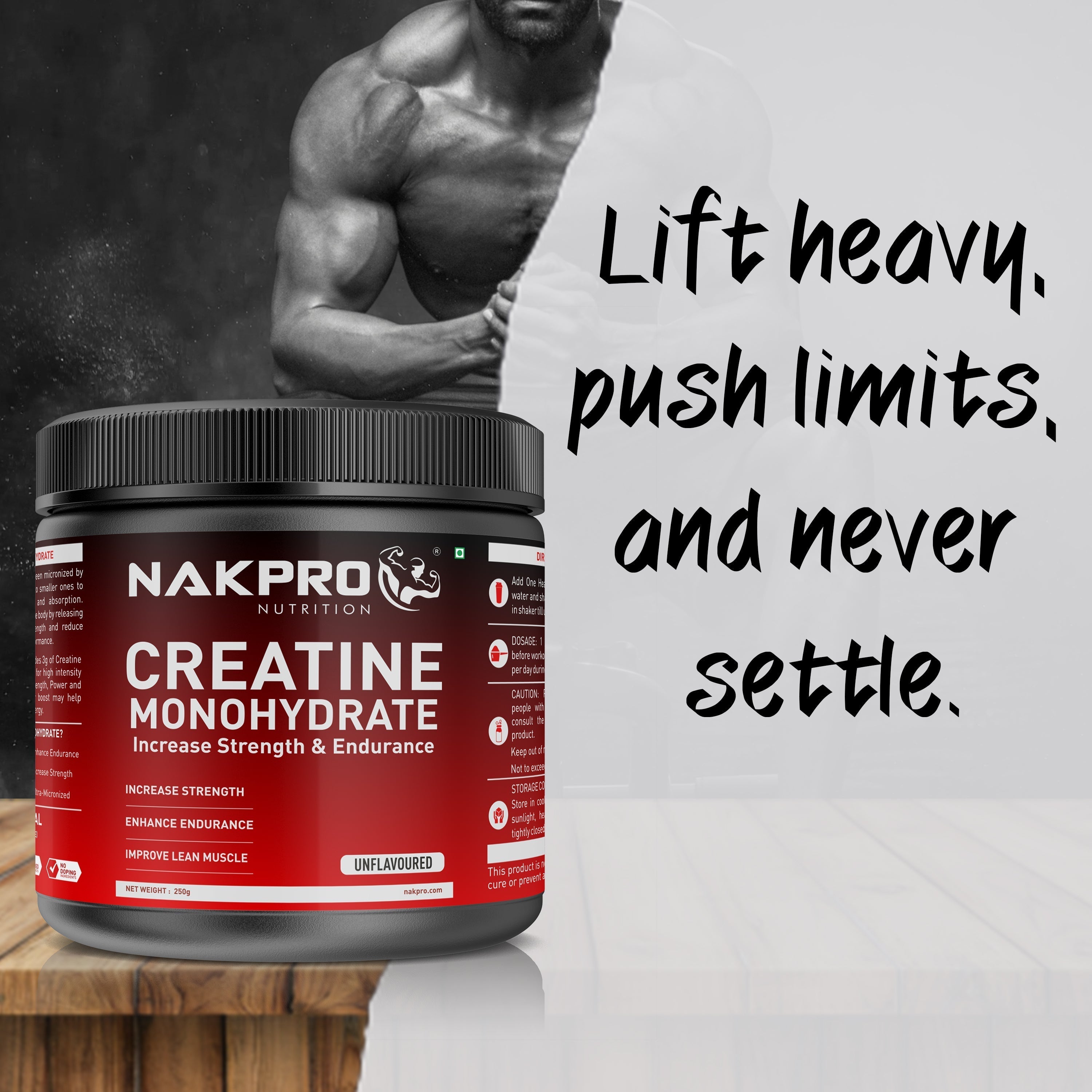 NAKPRO Creatine Monohydrate provides 4g of Creatine per serve, it provides additional fuel for high intensity training. This results in increased Strength, Power and Muscular Endurance. This muscular boost may help athletes achieve burst of Speed and Energy. Nakpro Micronized creatine monohydrate is essential in the process of sending energy directly to muscles and has been shown to help increase overall muscle mass and boost strength. Nakpro Sports Advance Micronised Creatine Monohydrate is the most potent, unadulterated and finest creatine powder helps in improving strength, power and allows to gain lean muscle mass
