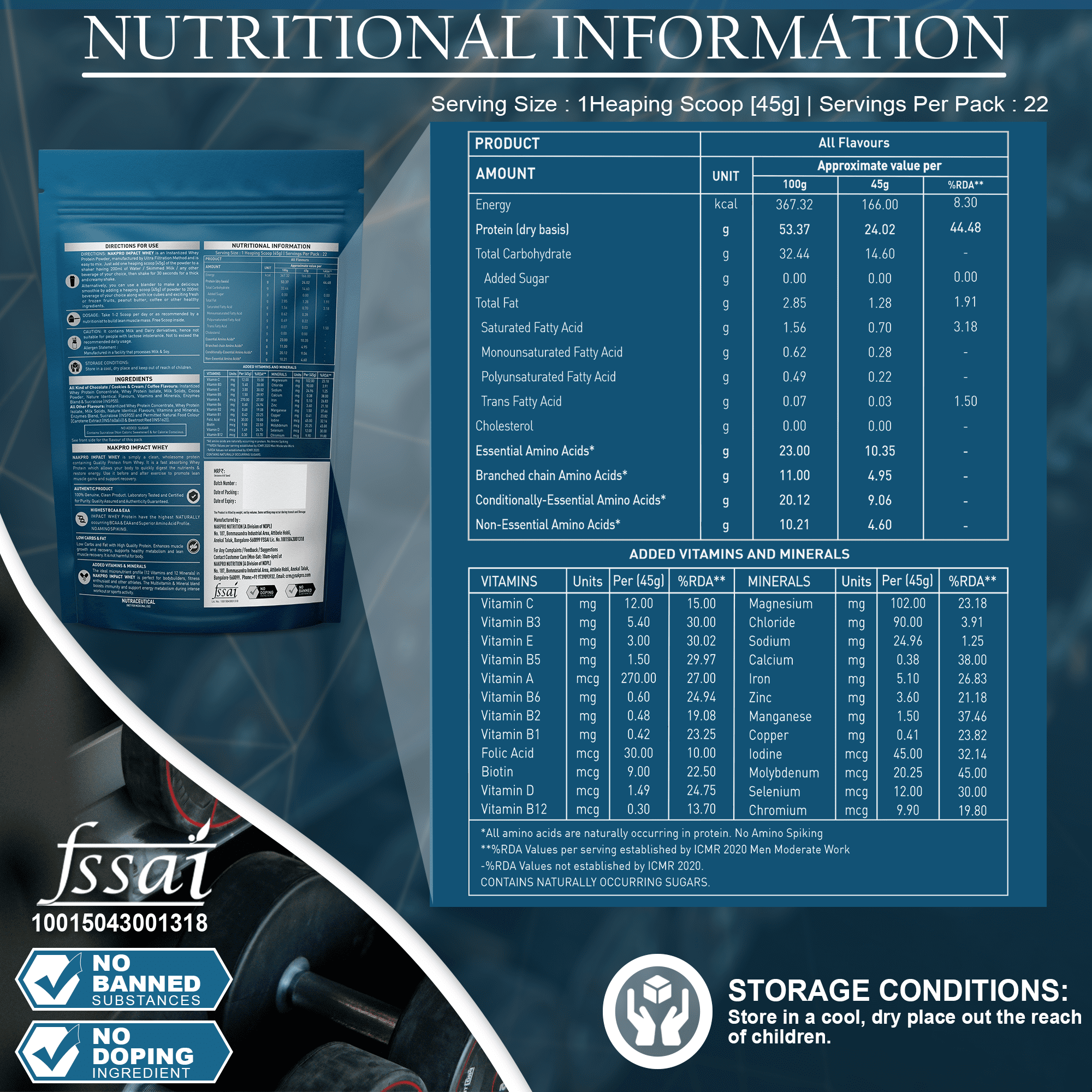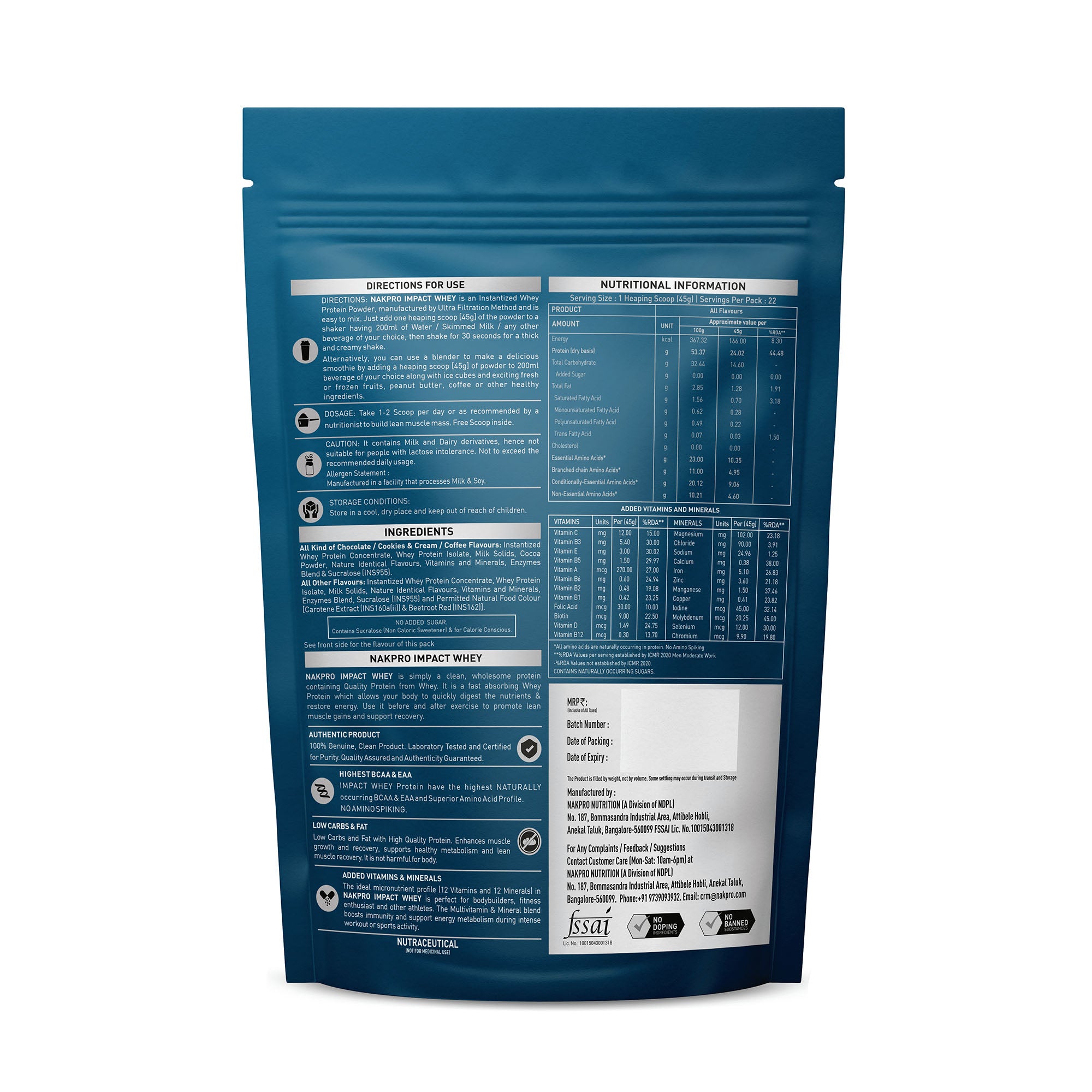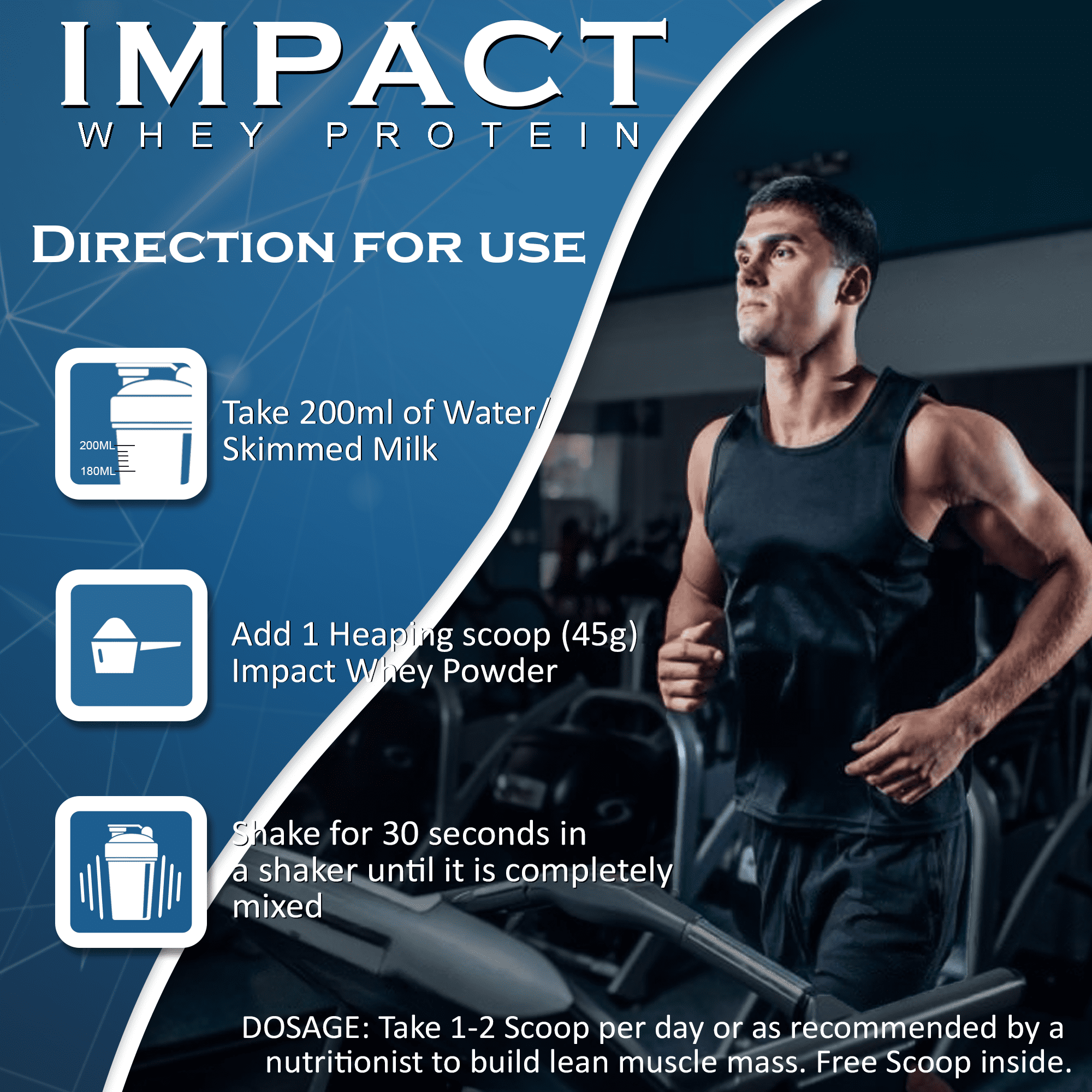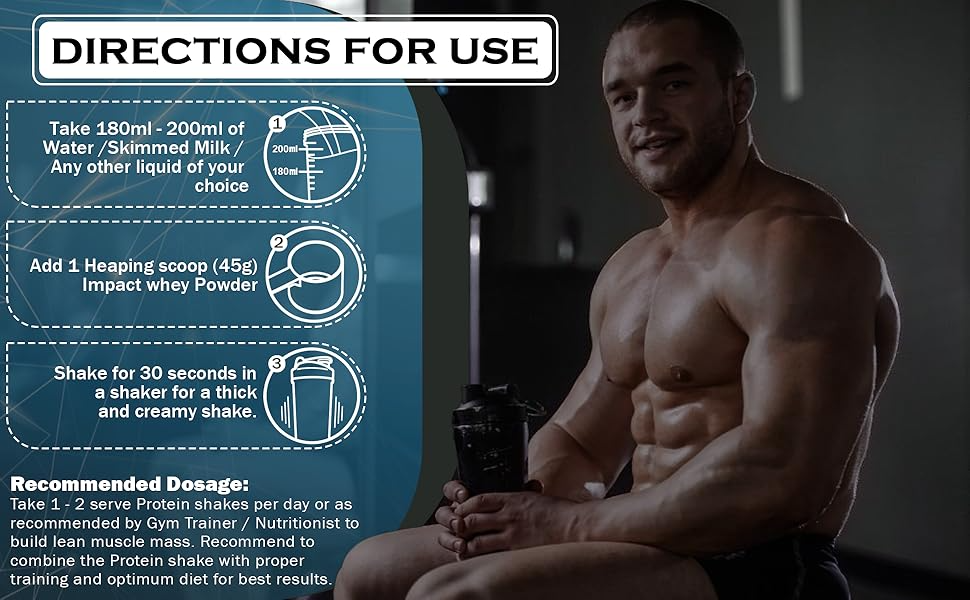 Add 1 heaping scoop (45g) of Nakpro Impact Whey in a shaker containing 200 ml of water, skimmed milk, or any other beverage of your choice. Shake well for 10–30 seconds. Consume immediately.