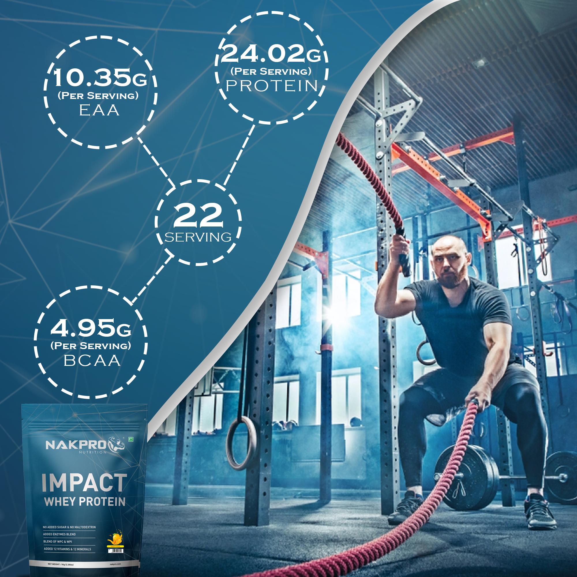 Nakpro Impact Whey Protein is a Premium three-blend of Whey Protein Isolate, Whey Protein Concentrate & Milk Solids. Impact Whey Protein helps to build and repair new muscle. Ideal for on-the-go, these delicious powders support and maintain various fitness goals. Whey Protein, or protein powder whey, is one of the most quickly absorbed proteins available, making it the perfect choice for post-workout recovery. It also provides branched chain amino acids (leucine, isoleucine, and valine) which are vital to maintaining healthy metabolism.