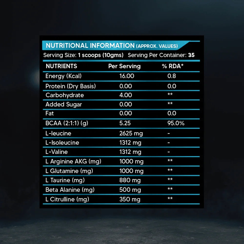 BCAA, AAKG, Glutamine, Natural and Artificial Flavours, Sweeteners