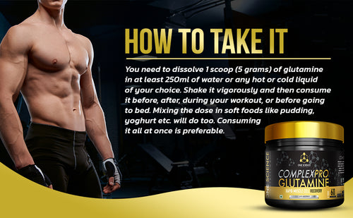 You need to dissolve your dose of glutamine (5 grams) in at least 250ml of either hot or cold liquid of your choice. Shake it vigorously and then consume it before, after or even during your workout. Mixing the dose in soft foods like pudding, yoghurt etc. will do too. Consuming it all at once is preferable.