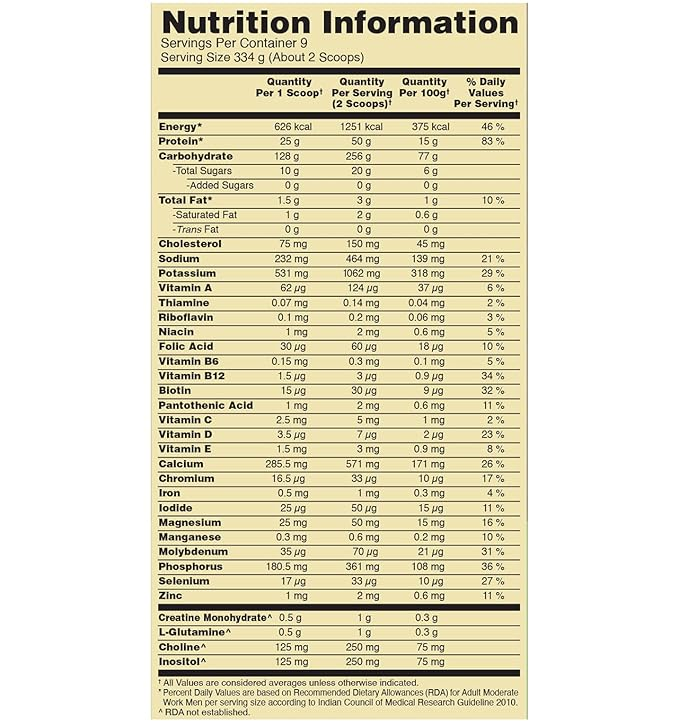 Maltodextrin (75%), Protein Blend (18%) (Whey Protein Concentrate, Calcium Caseinate, Whey Powder) (Emulsifier: INS 322i), Cocoa Powder (Processed with Alkali), Artificial Flavor (Chocolate), Creatine Monohydrate, L-Glutamine, Vitamin and Mineral Blend (Sodium Chloride, Calcium Phosphate Tribasic, Magnesium Phosphate, Calcium Lactate, L-Ascorbic Acid, Zinc Sulfate, DL-Alpha-Tocopheryl Acetate, Nicotinamide, Ferric Pyrophosphate, Manganese Sulphate, Calcium D-Pantothenate, Pyridoxine Hydrochloride, Riboflavin, Thiamine Mononitrate, Retinyl Palmitate, Folic Acid, D-Biotin, Potassium Iodide, Chromium Chloride, Sodium Molybdate, Sodium Selenite, Ergocalciferol, Cyanocobalamin), L-Choline Bitartrate, Sweetener (INS 950), Inositol, Medium Chain Triglycerides Powder.