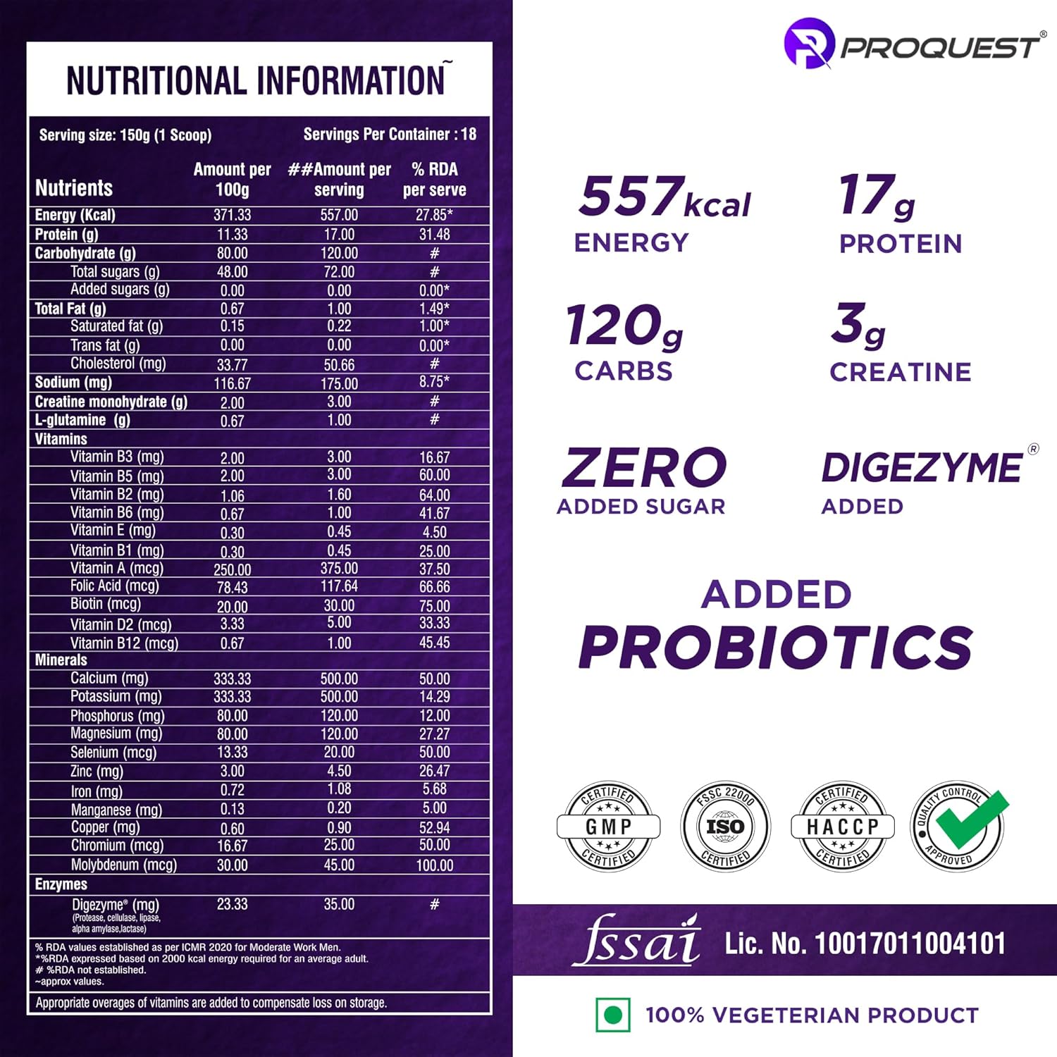 Proquest Nutrition Mass Gainer | High Calorie Weight Gainer | 557Kcal, 120G Carbs, 17G Protein, 3G Creatine | Muscle Growth & Recovery Supplement | 2.72 Kg