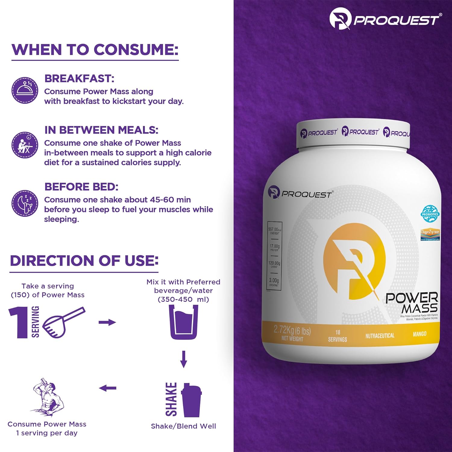 Proquest Nutrition Mass Gainer | High Calorie Weight Gainer | 557Kcal, 120G Carbs, 17G Protein, 3G Creatine | Muscle Growth & Recovery Supplement | 2.72 Kg - Mango is backordered and will ship as soon as it is back in stock.