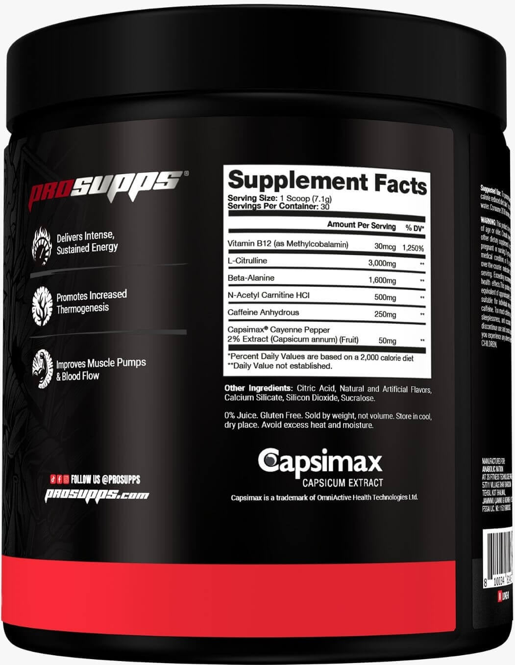 ProSupps HYDE® Thermo is a high-powered thermogenic pre-workout designed to help you simultaneously build lean muscle and burn fat. Fueled by 50mg of Capsimax® (a potent chili pepper extract), 250mg of caffeine, 30mcg of Vitamin B-12, and 500mg of N-Acetyl-L-Carnitine, this formula delivers clean energy, laser-sharp focus, and thermogenic support.