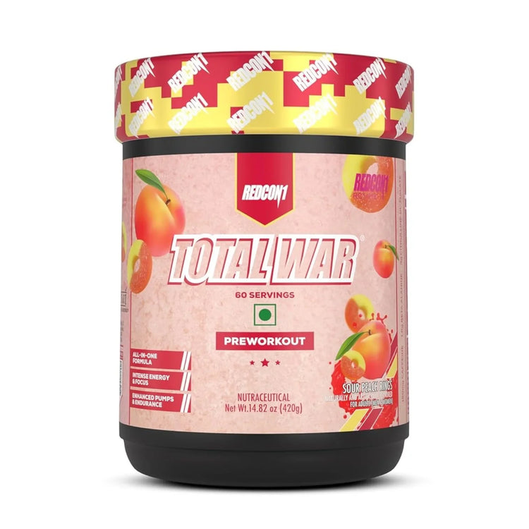 - Redcon Total War is a pre-workout like no other. If you are looking to take your training intensity to the extreme then you need to be looking at adding Total War to your pre-workout routine. Total War combines the strongest compounds to provide the user with an all in one pre-workout that offers intense energy, Laser focus and skin splitting muscle pumps. Total War is not for the faint-hearted and will leave you smashing through plateaus and buzzing to get to the gym after taking a scoop! Redcon Total War is designed for anyone who takes their training seriously, undergoes strenuous, intense workouts and needs a pre-workout to get them through the toughest of workouts with blistering energy as well as a decent pump blend to provide you with a stim and pump based pre-workouts.