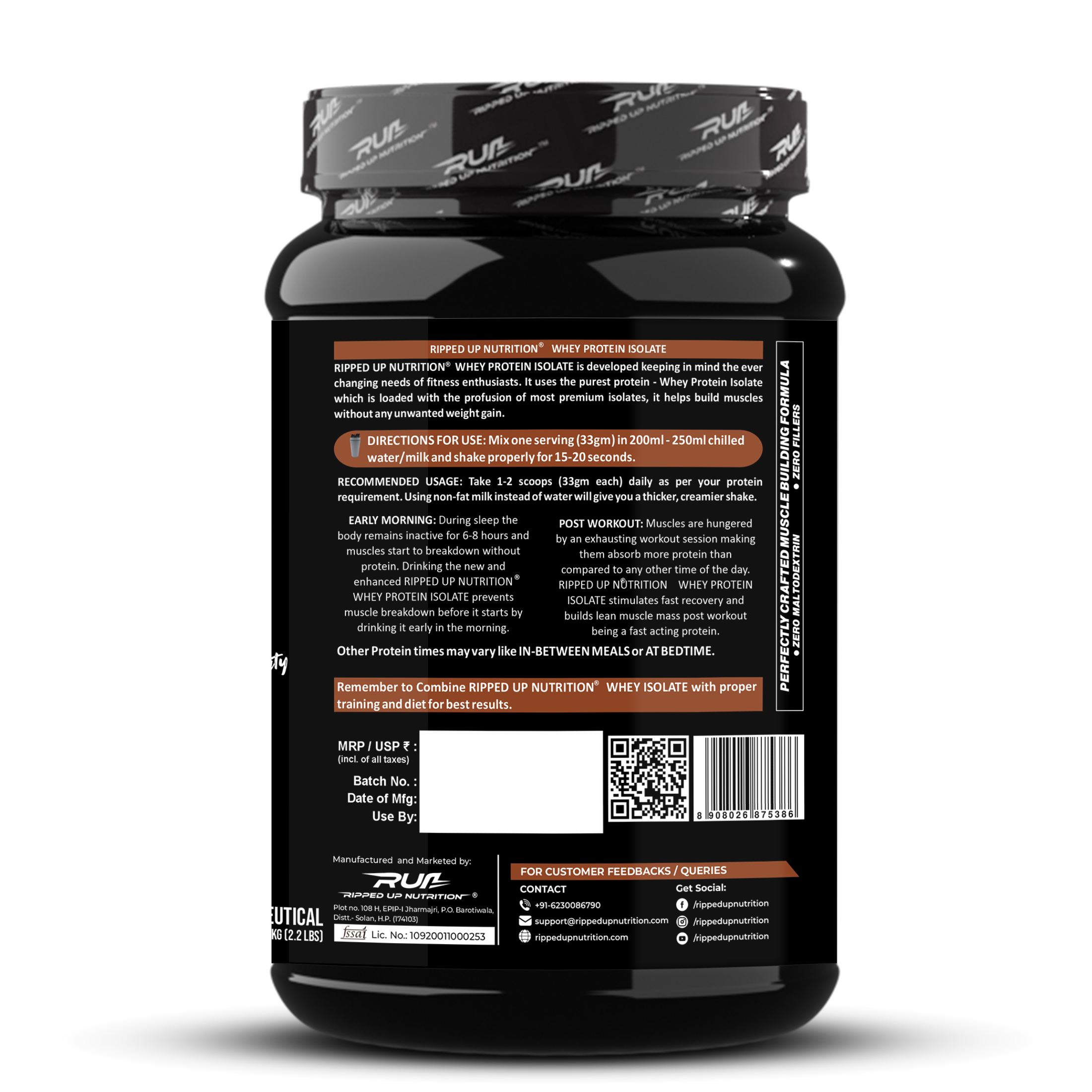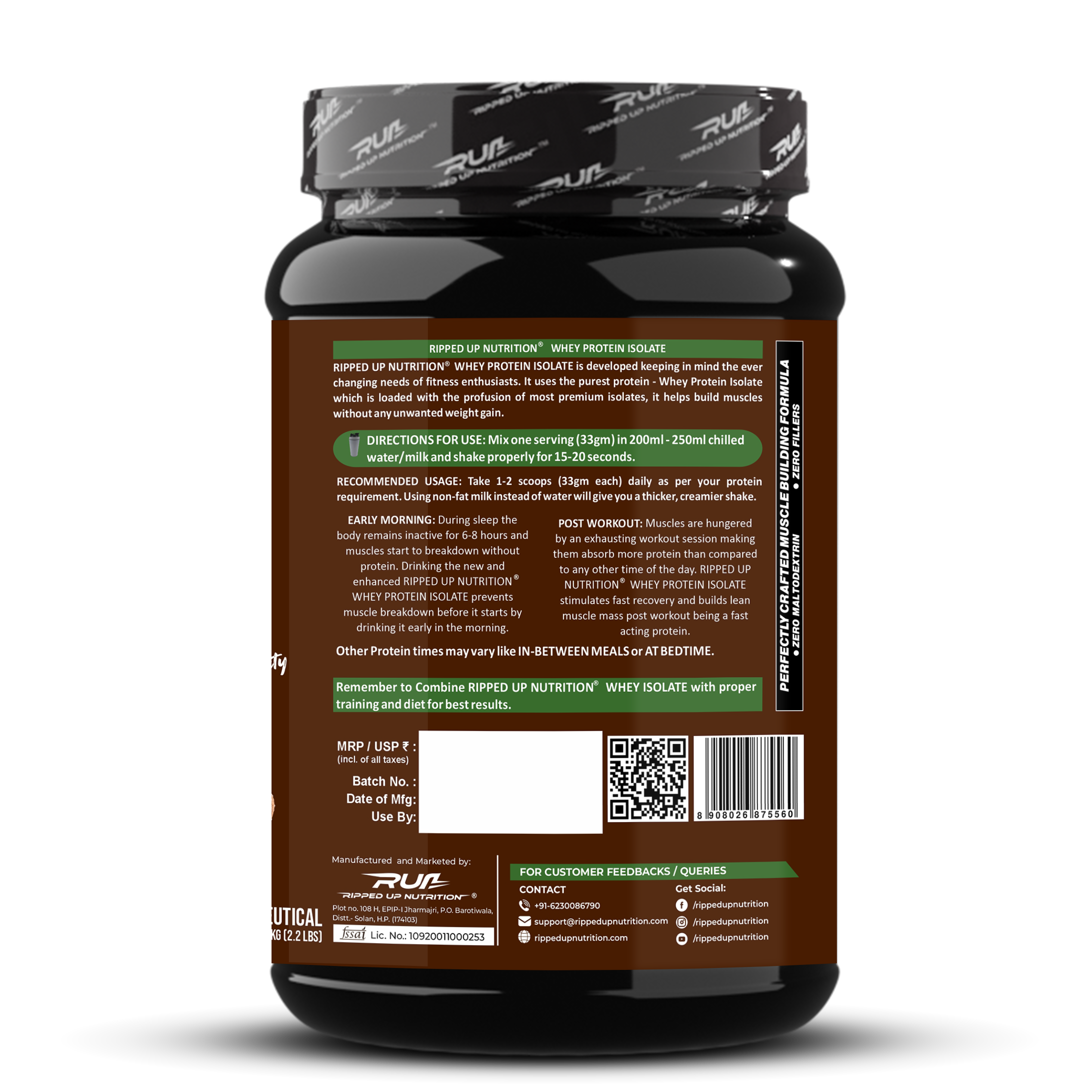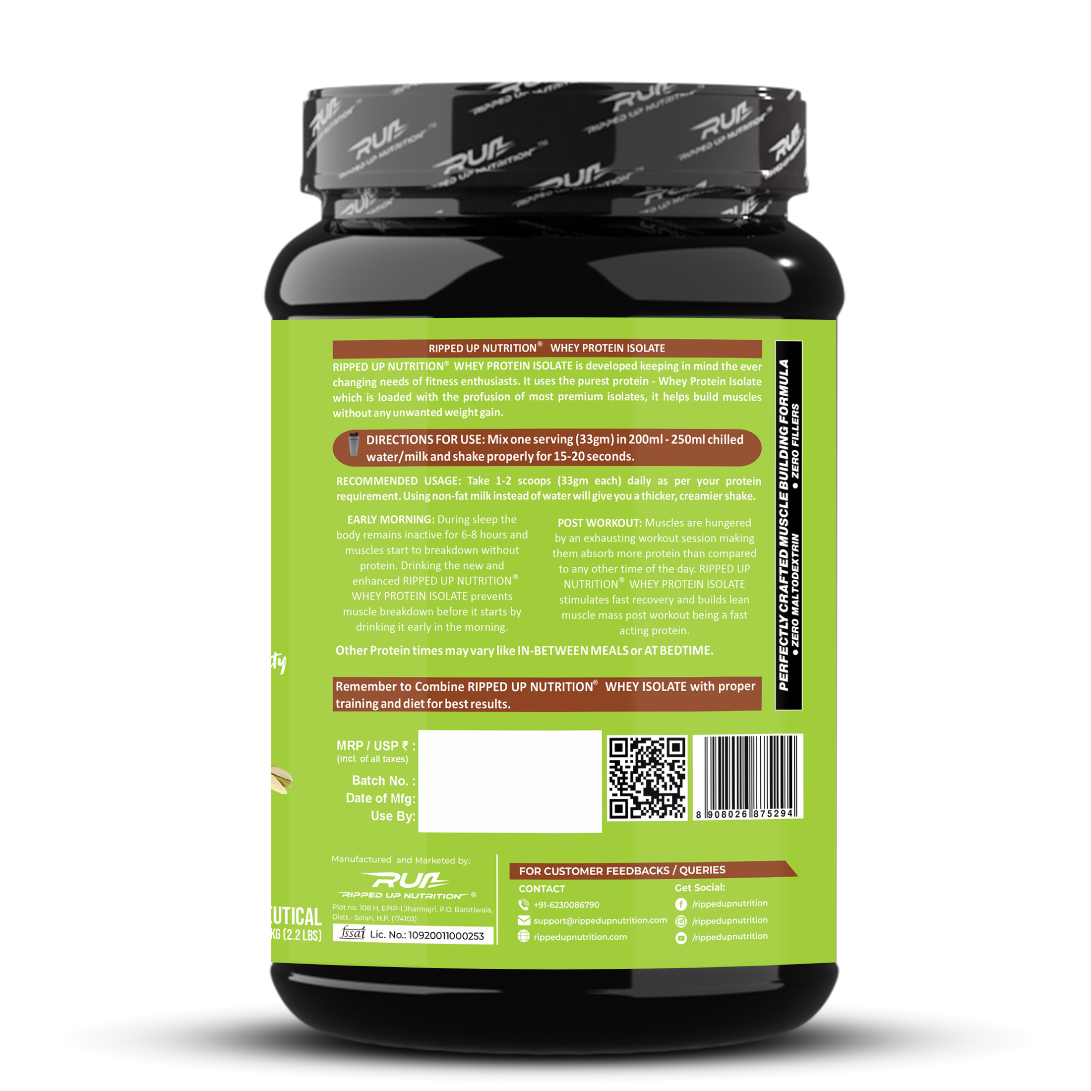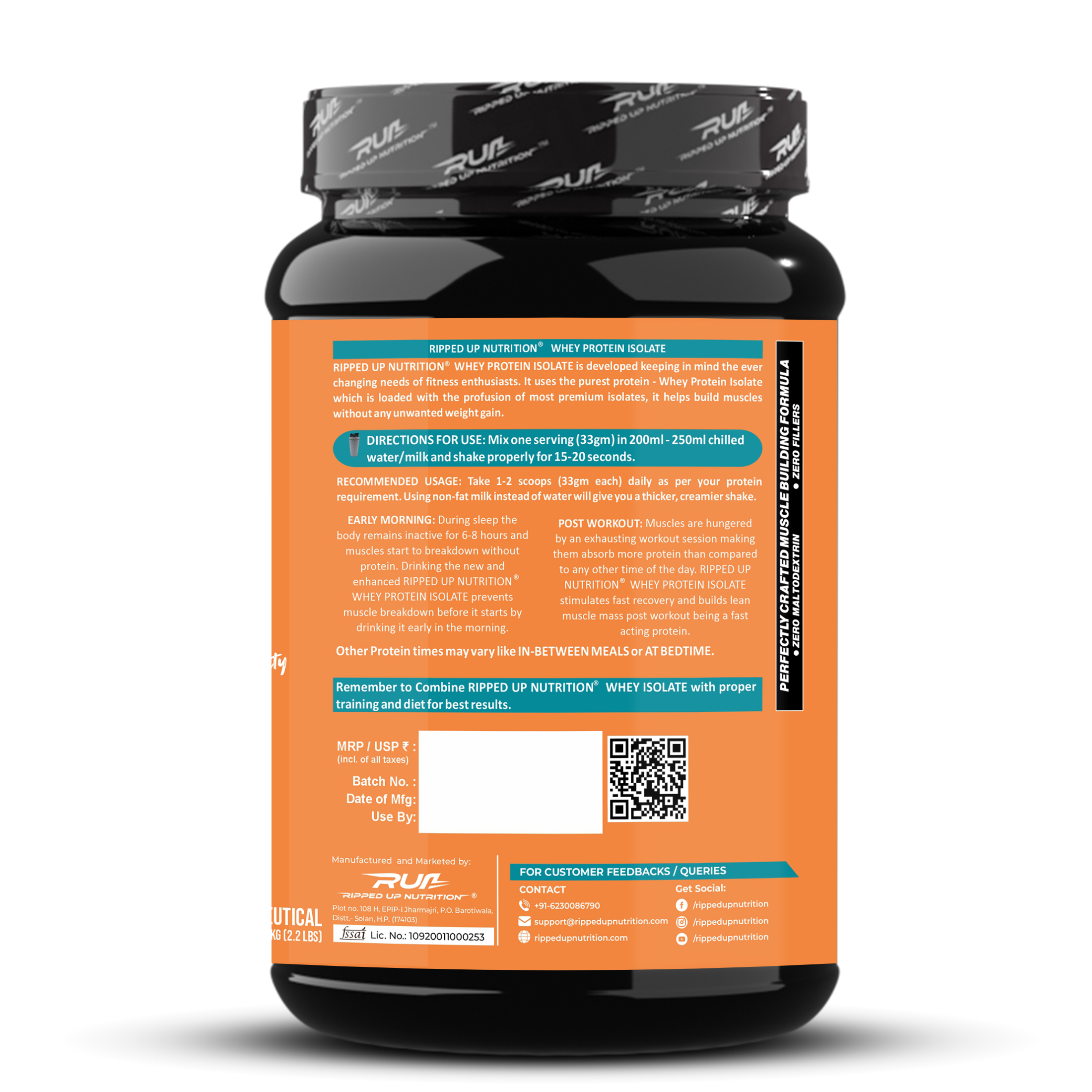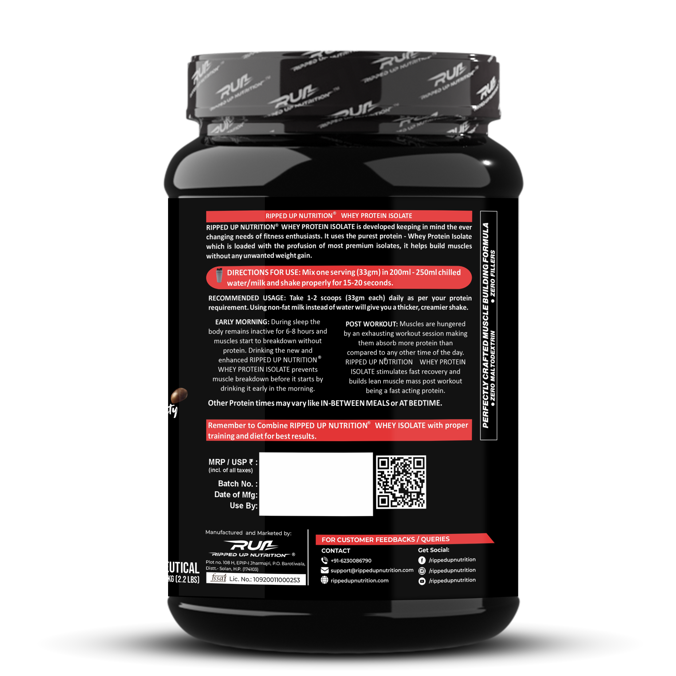 RIPPED UP NUTRITION Whey Isolate is crafted for fitness enthusiasts seeking clean, high-performance protein. Made with 100% Whey Protein Isolate imported from the USA, it’s free of fat, carbohydrates, and lactose, delivering 27g of protein, 5.75g BCAAs, and 0g sugar per serving to support muscle growth, strength, and physique goals—without unwanted weight gain.