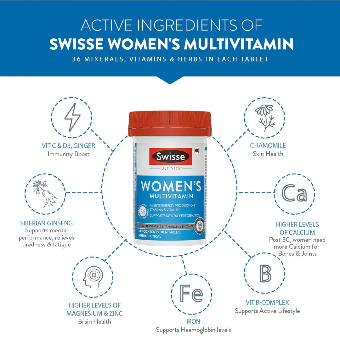 Swisse Women’s Multivitamin is suitable for adult women and intended to complement a balanced diet and healthy lifestyle. It does not claim to treat or cure any medical condition.