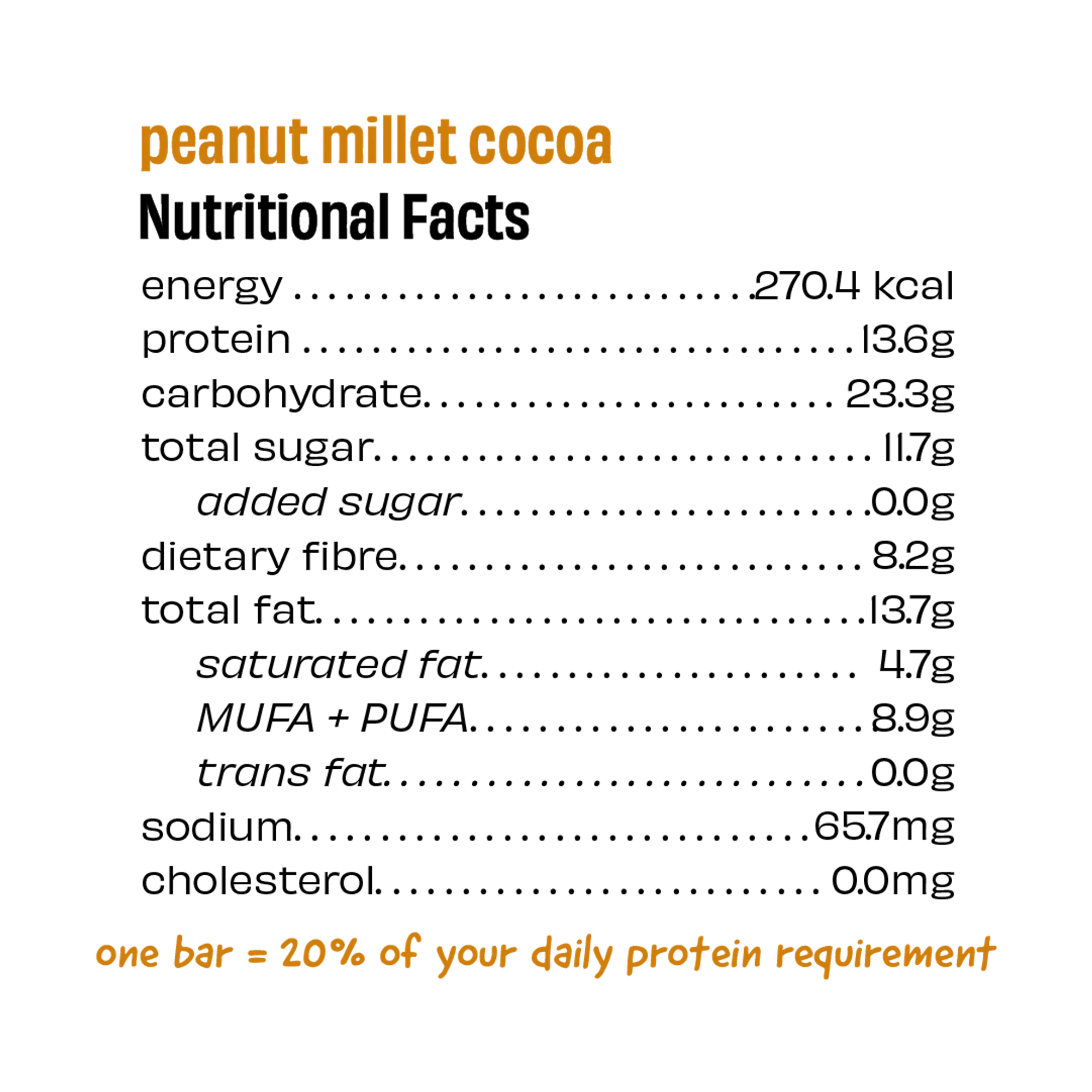 Peanut Millet Cocoa : Peanuts - 40.9%, Dates - 27.7%, Whey Protein Concentrate - 11.5%, Cocoa Solids - 6.9%, Cocoa Butter - 5.8%, Ragi - 4.5%, Bajra - 2.7%
