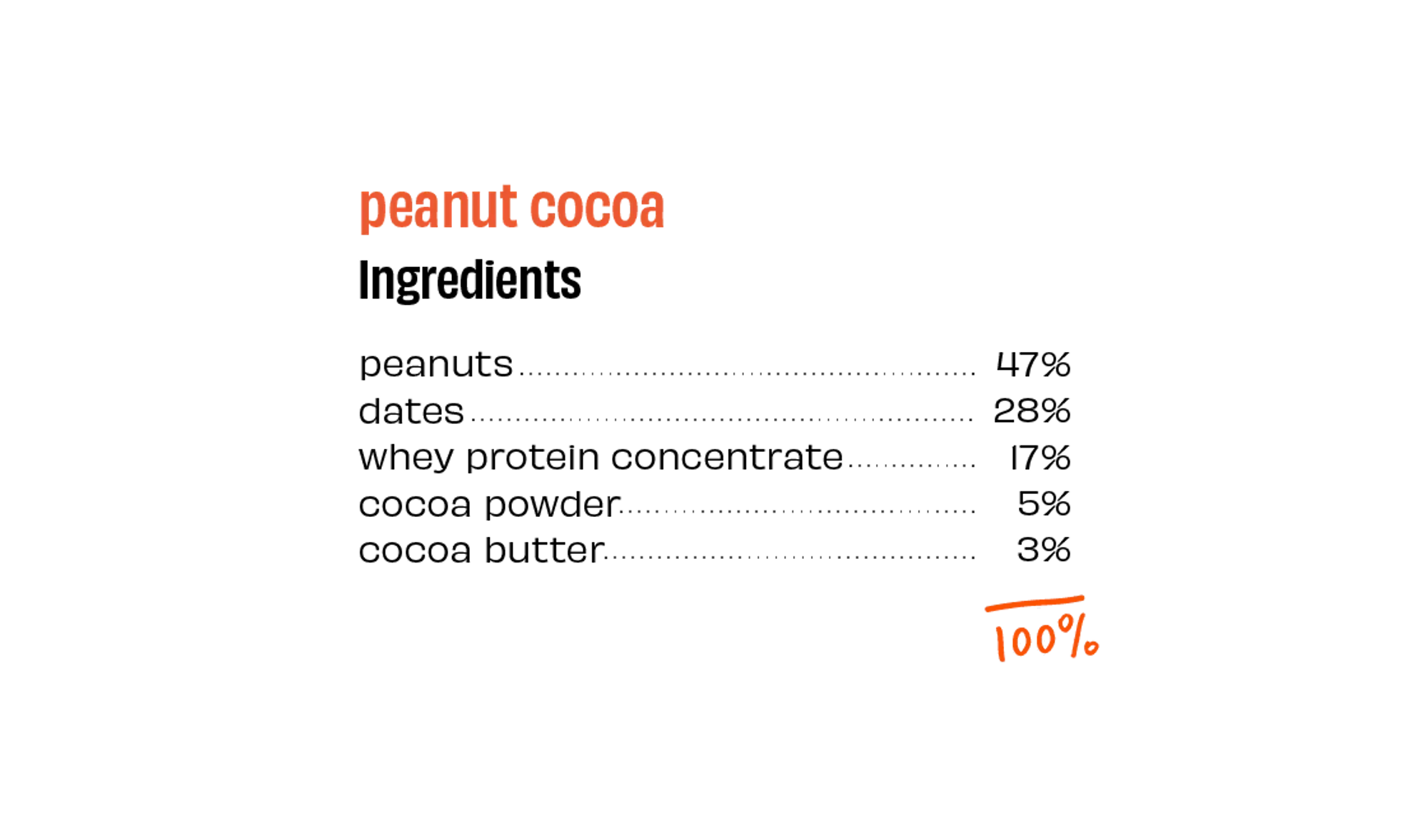 Peanut Cocoa : Cashew Kernels 34% Dates 26% Whey Protein Blend 19% Almond Kernels 10% Cocoa Powder 6% Cocoa Butter 5%