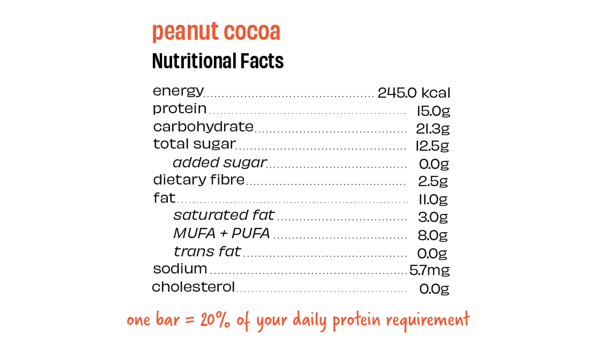 Peanut Butter : Peanuts (39%), Dates (22%), Cranberries (20%), Raw Whey Protein (17%), Cocoa Butter (2%)