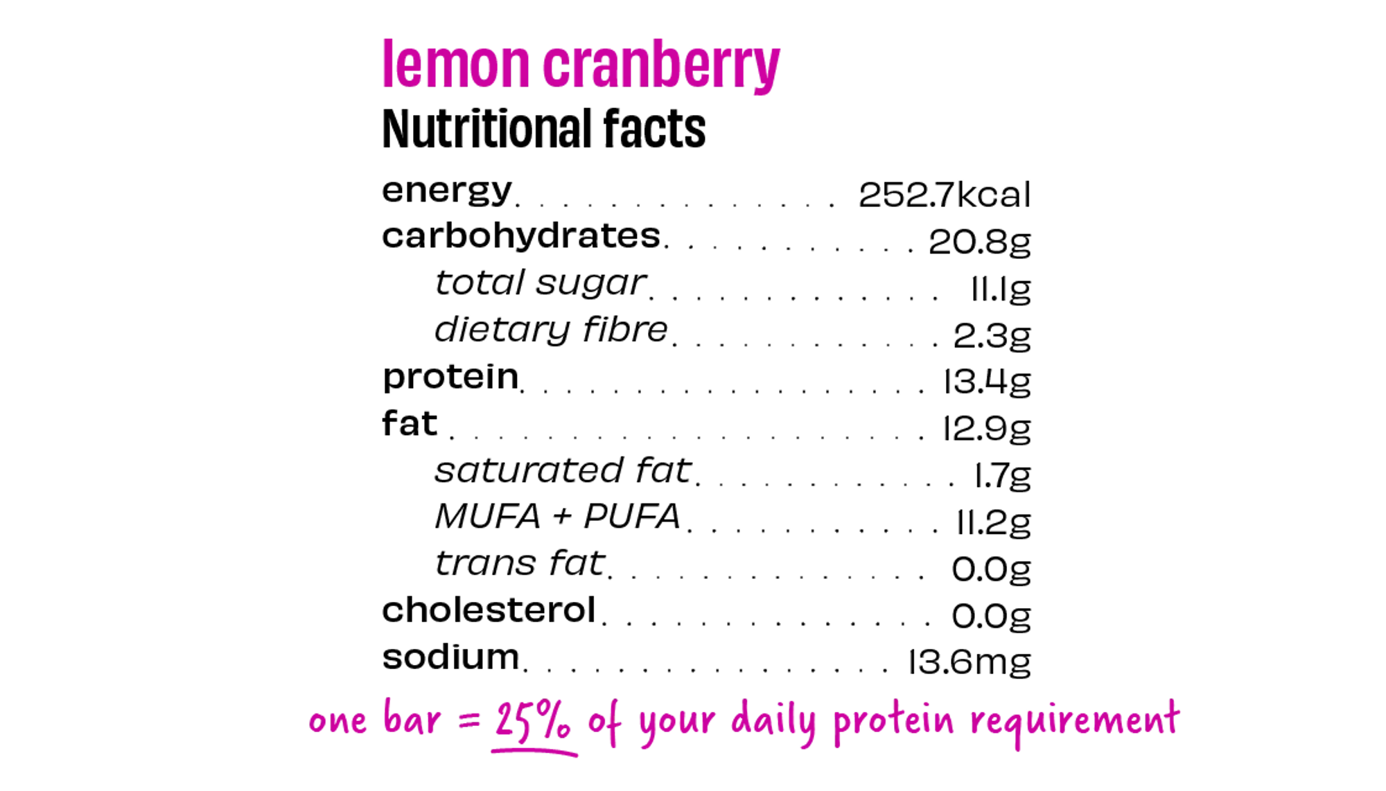 Lemon Cranberries : Almonds - 23%, Cashews - 23%, Dates - 21%, Whey Protein Concentrate - 17%, Cranberries - 12%, Cocoa Butter - 4%, Plus A Dash Of Lemon Oil.