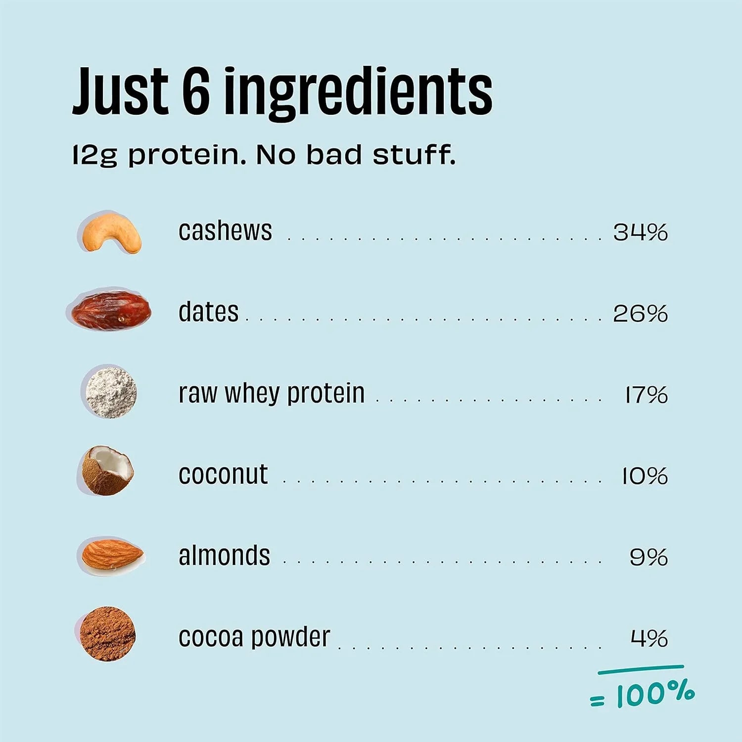 Coconut Cocoa : Cashew Nuts (34%), Dates (26%), Raw Whey Protein (17%), Coconut (10%), Almonds (9%), Cocoa Powder (4%)