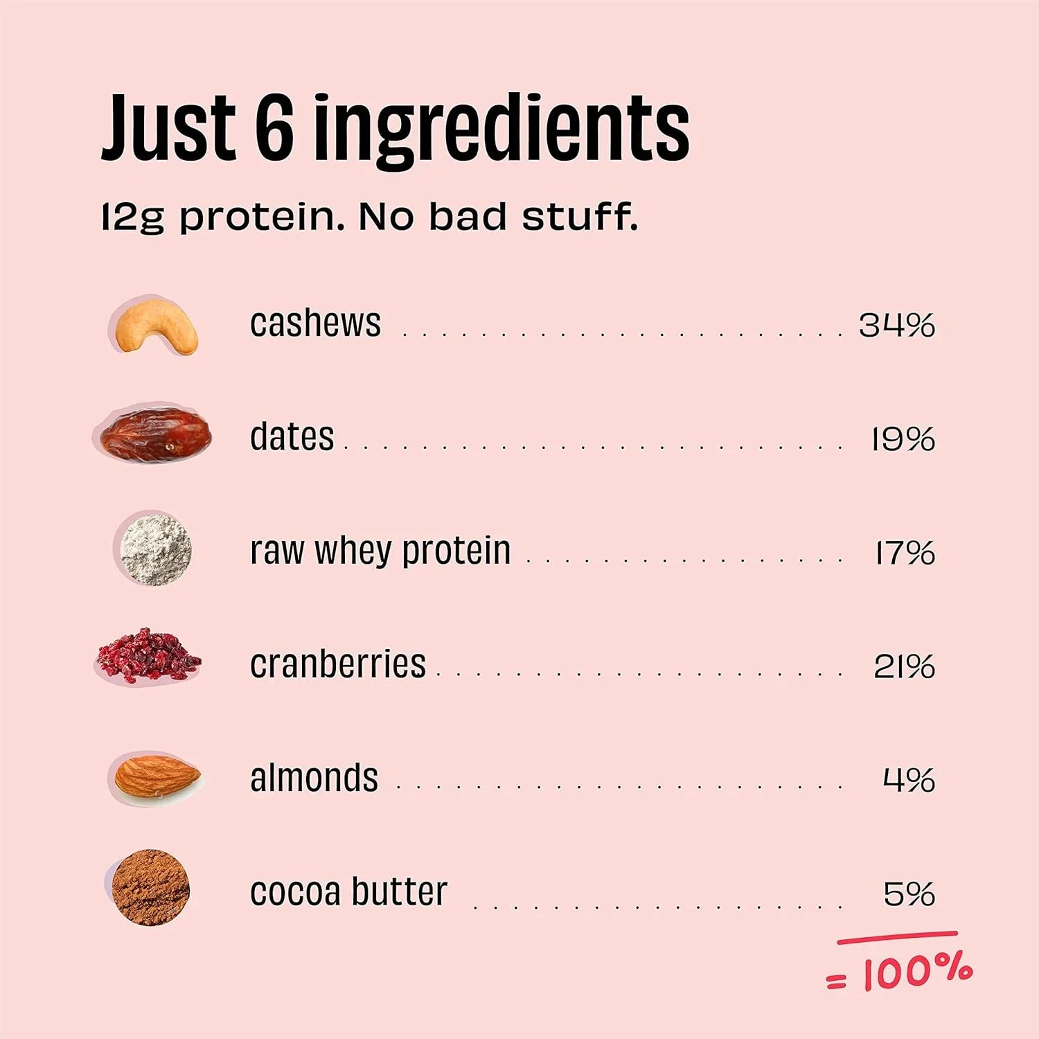 Cranberry : Cashew Nuts (34%), Cranberries (21%), Dates (19%), Raw Whey Protein (17%), Cocoa Butter (5%), Almonds (4%)
