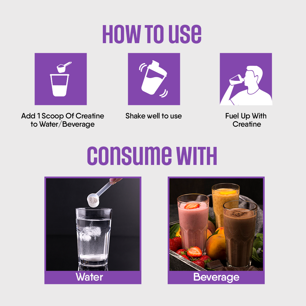 Take 1 Scoop (3g approx.) of Creatine Monohydrate in 100-150ml chilled water.