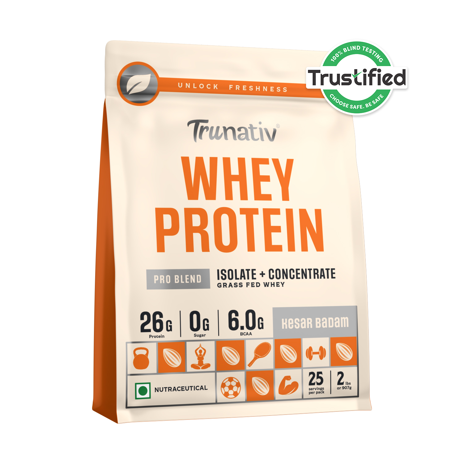 Rediscover the luxurious flavors of tradition with TruNativ Pro Blend Kesar Badam Whey Protein Powder. Packed with the goodness of saffron and almonds, this protein supplement offers 26g of grass-fed whey protein and 6g of BCAAs per serving, ensuring exceptional recovery and performance. TruNativ’s nutraceutical-grade quality ensures a clean, sugar-free, and vegetarian-friendly solution for your health and fitness needs.