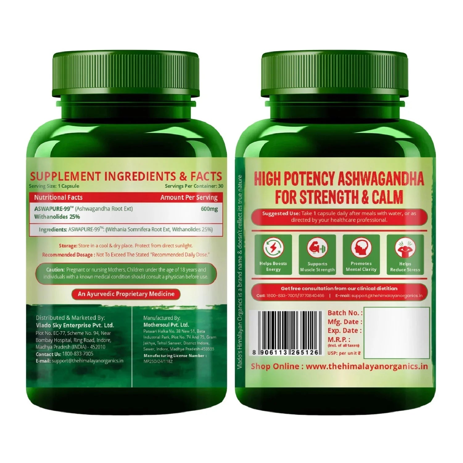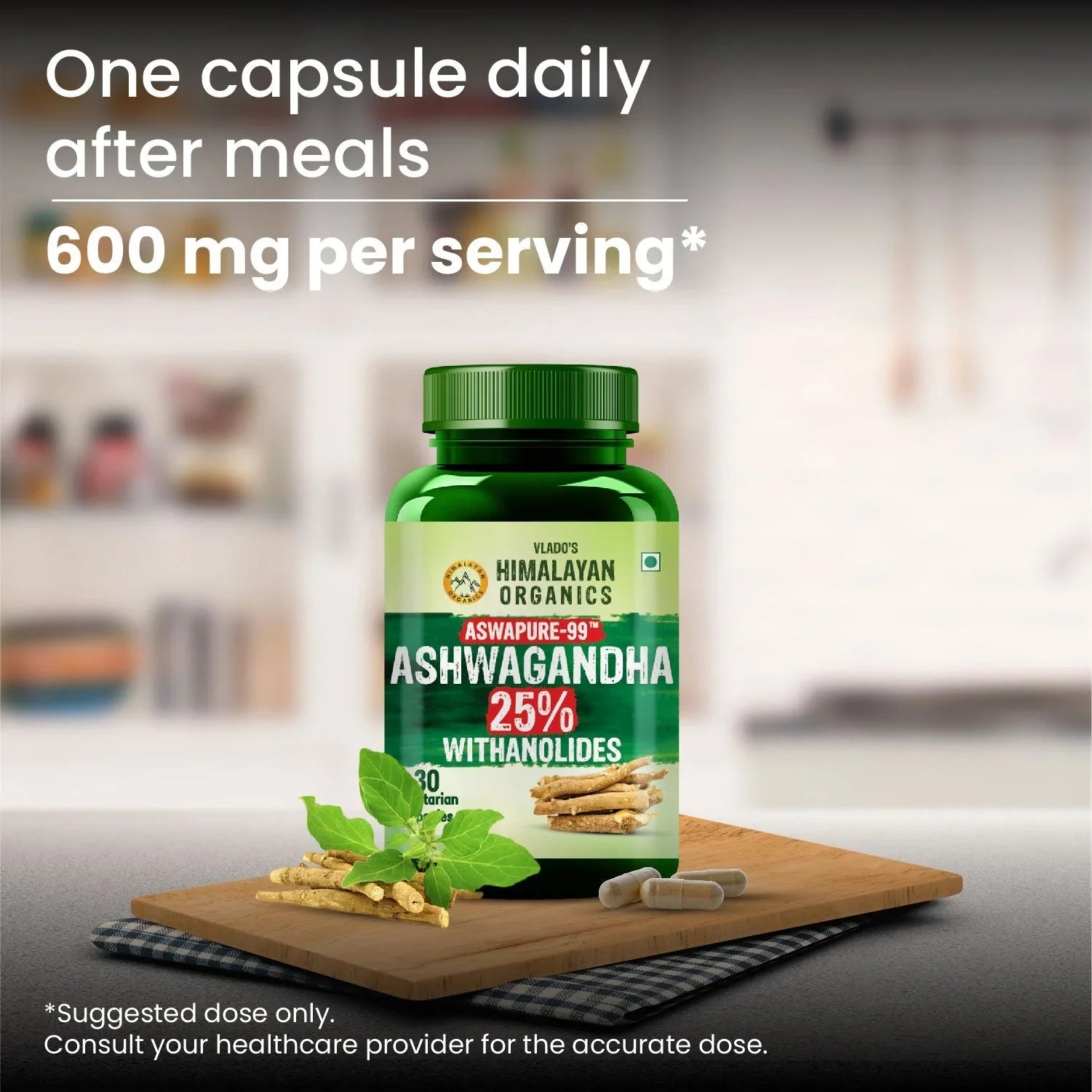 Vlado's Himalayan Organics, Ashwagandha 25% Withanolides 600mg, Maximum Potency Ayurvedic Supplement - 30 Capsules