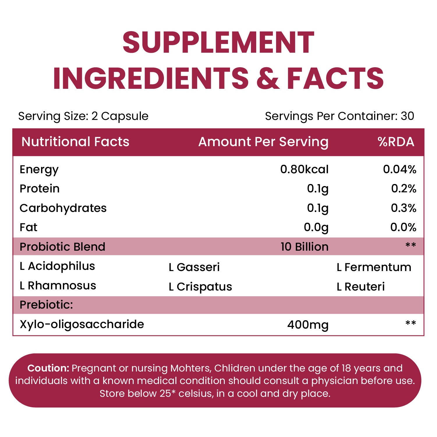 Take 2 capsule daily after meals with water, or as advised by a healthcare professional. Each serving contains a 10 Billion CFU probiotic blend with Lactobacillus strains & prebiotics, formulated for internal feminine health.