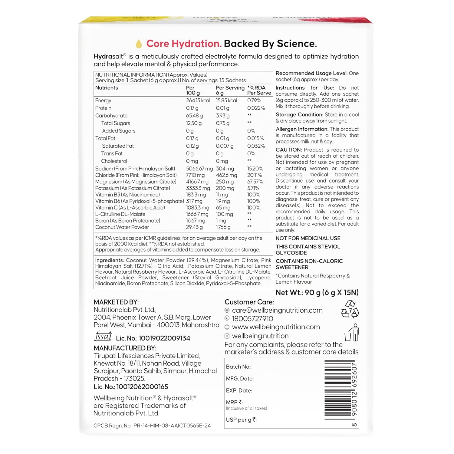 Wellbeing Nutrition HydraSalt Electrolyte Drink with Zero Added Sugar | 5 Electrolytes & 3 Vitamins for Instant Hydration, Energy, Performance & Recovery | 90g, Pack of 15 - Raspberry Lemon is backordered and will ship as soon as it is back in stock.