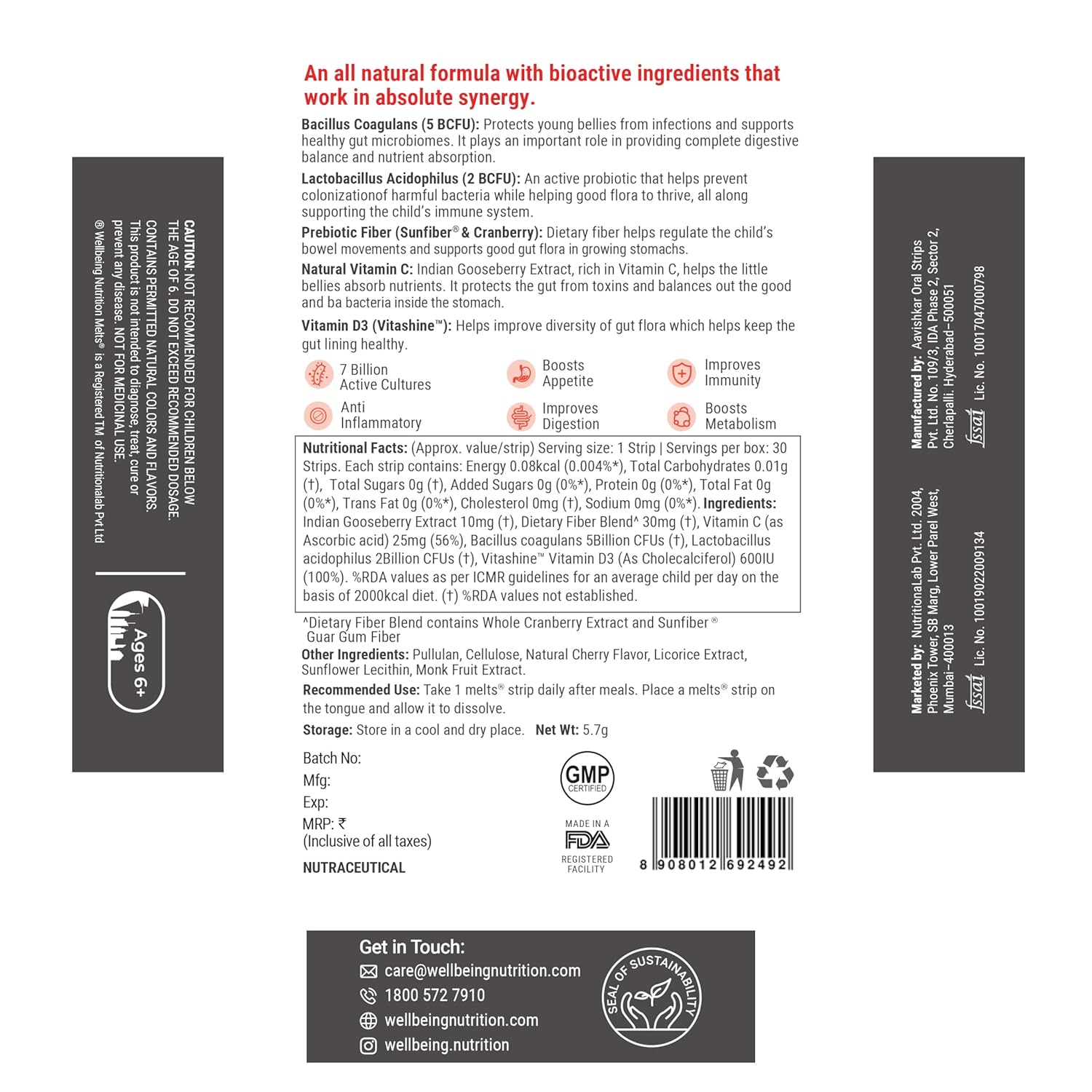Wellbeing Nutrition Marvel Melts Probiotics & Prebiotics for Kids | 7B CFU, Vitamin C & D3 | Improve Digestion, Immunity & Gut Health | 30 Oral Strips