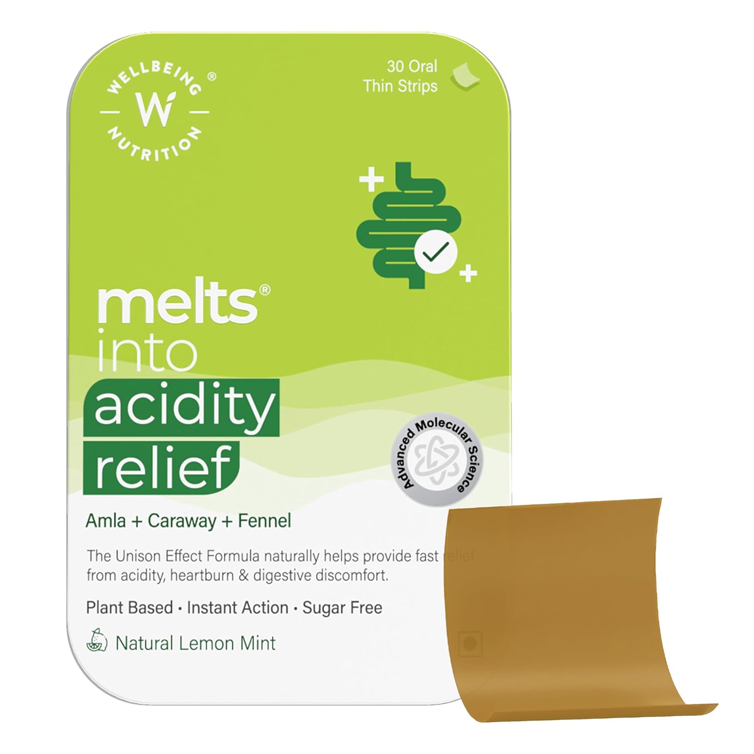 Wellbeing Nutrition Melts Acidity Relief | Clinically Proven Natural Antacid with Amla, Caraway, Fennel | Relief for Acidity, Heartburn & Reflux | 30 Oral Strips