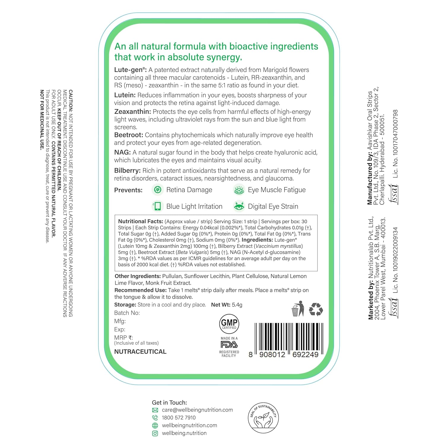 Wellbeing Nutrition Melts Eye Care | Lutein 10mg, Zeaxanthin 2mg, Bilberry, Beetroot | Improves Vision & Reduces Digital Strain | 30 Oral Strips