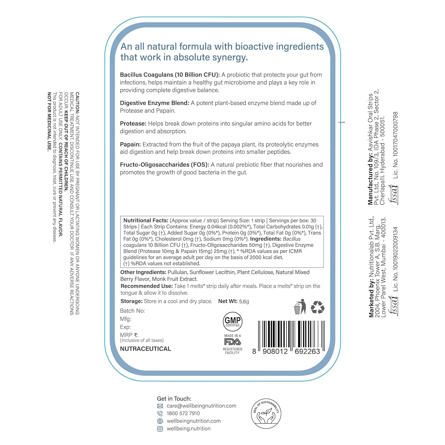 Wellbeing Nutrition Melts Healthy Gut | 10B CFU Probiotics, Digestive Enzymes, FOS | For Indigestion, Gas, Acidity and Bloating | 30 Oral Strips