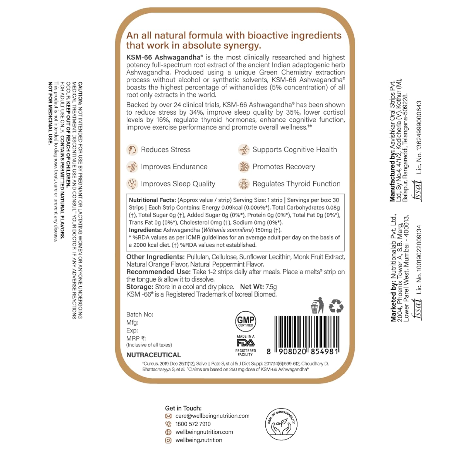 Wellbeing Nutrition Melts Pure Ashwagandha | Clinically Proven Organic KSM-66 Ashwagandha | Natural Stress Relief, Vitality & Stamina | 30 Oral Strips