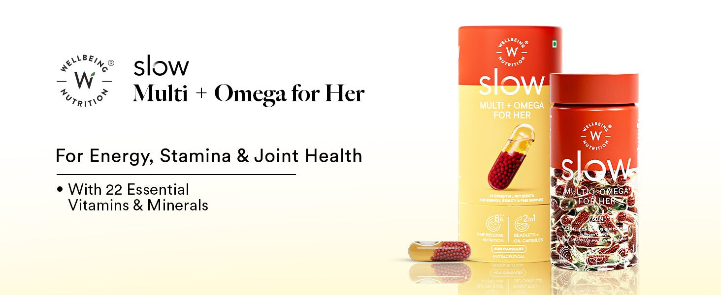 Wellbeing Nutrition Slow Multi+Omega for Her | Skin Radiance, Energy, Metabolism, PMS | 60 Veg Capsules - Unflavoured is backordered and will ship as soon as it is back in stock.