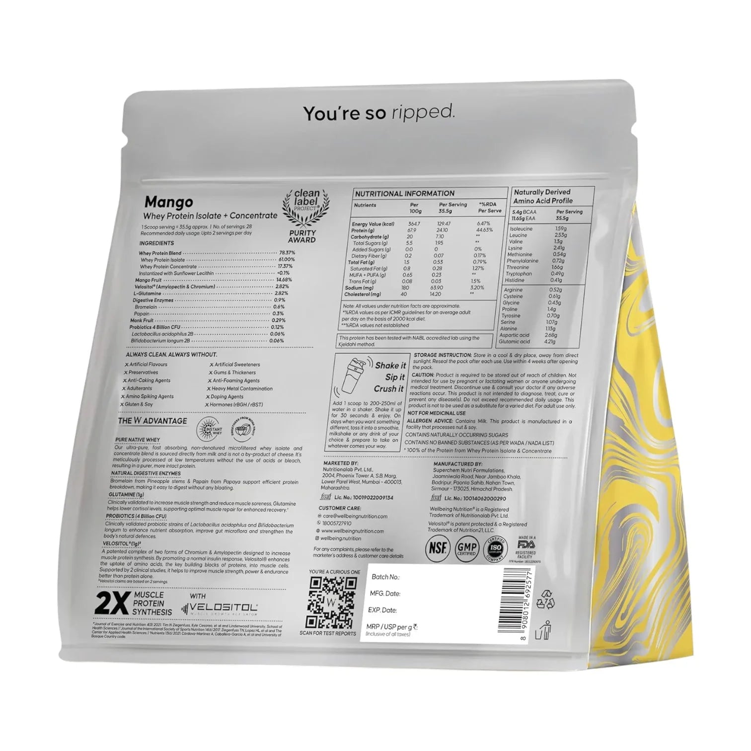 Wellbeing Nutrition Whey Protein Isolate & Concentrate | 24g Protein, Clinically Proven Velositol 2x Muscle Protein Synthesis, 4B CFU Probiotics | 1 Kg - Mango is backordered and will ship as soon as it is back in stock.